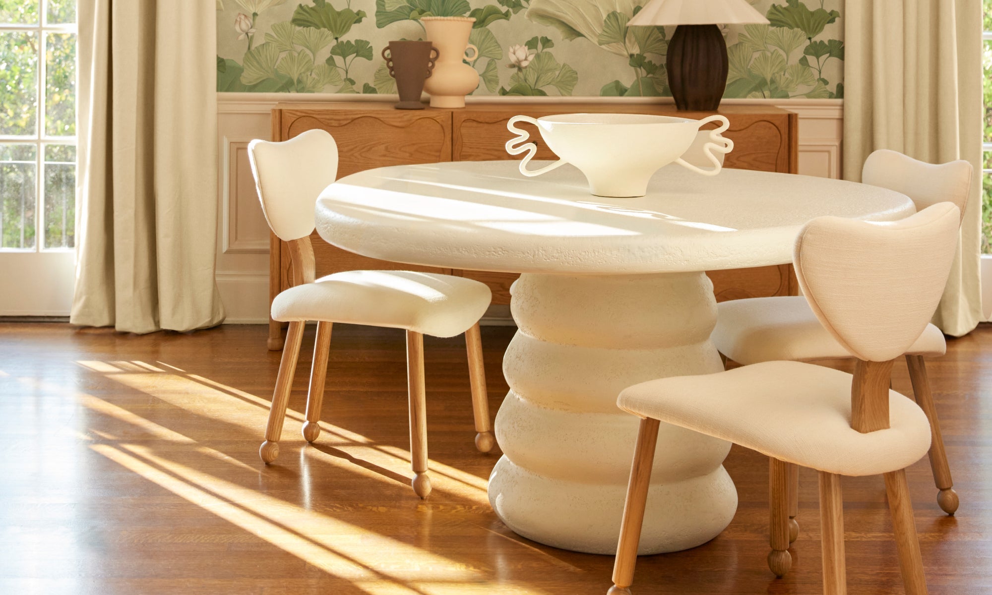 Wallpaper lend this space artful pattern while a sculptural dining table and chairs ground the room in casual elegance.