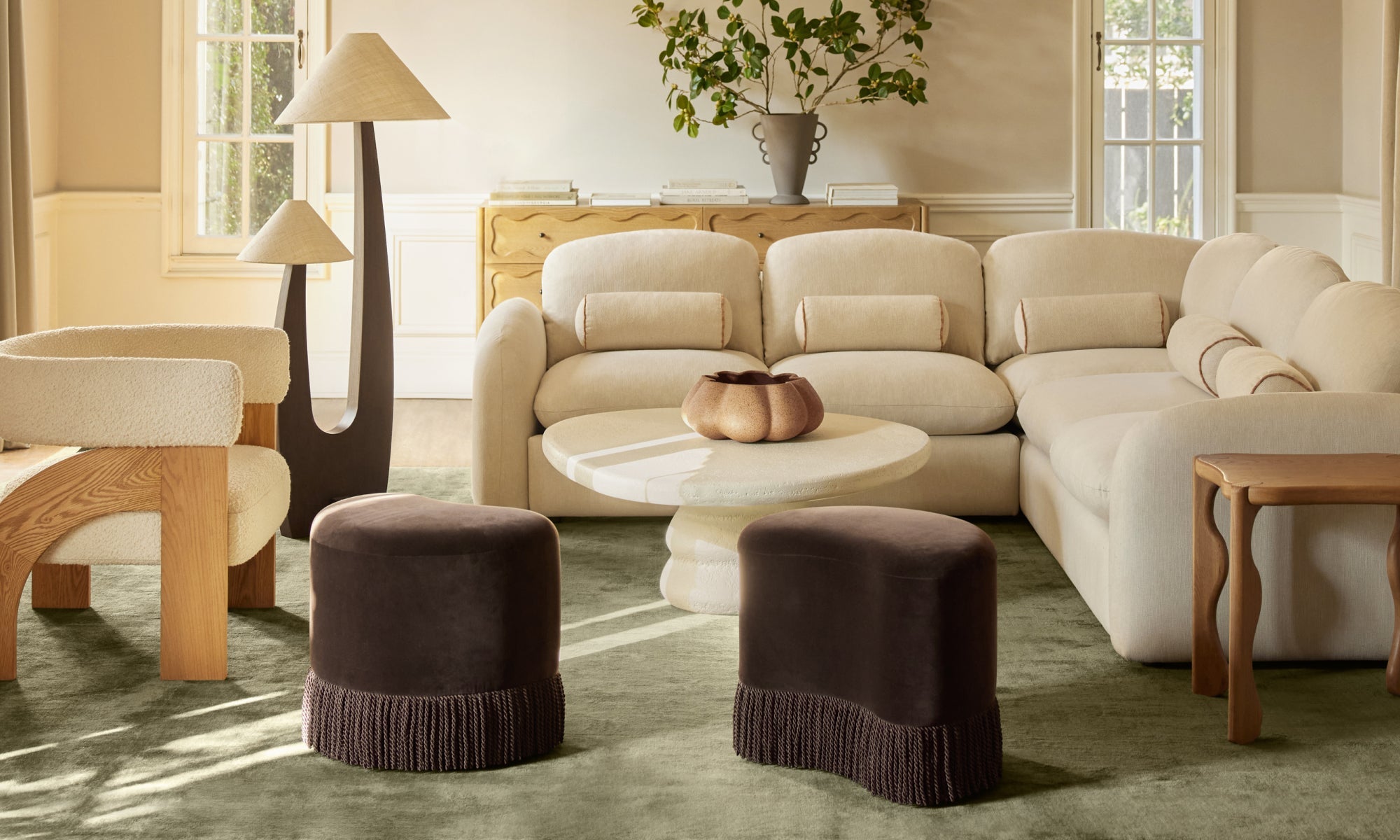 A living room that feels cozy and elevated at once with a soft neutral palette and curved forms.