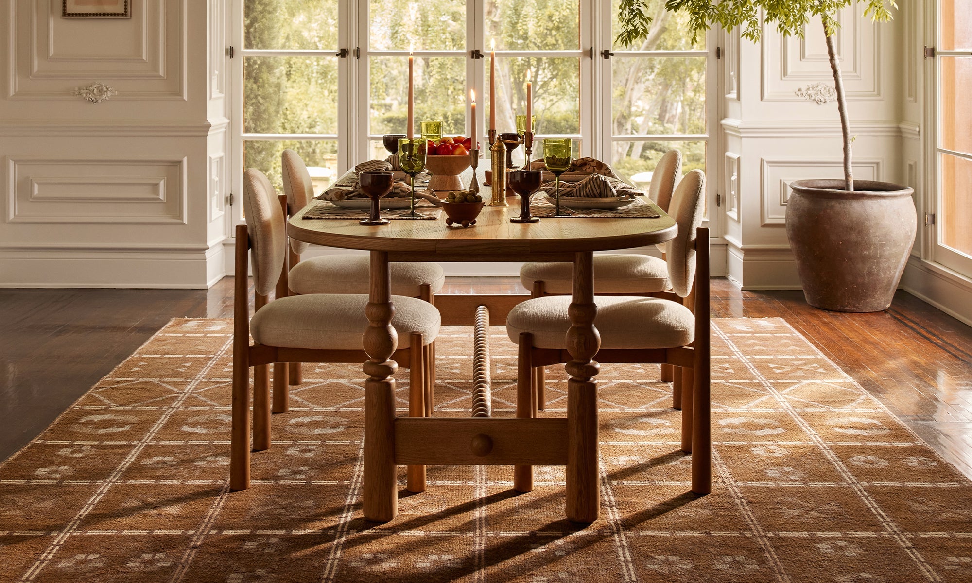 Statement lighting and sculptural silhouettes refresh traditional touches and natural textures, bringing a thoughtfully eclectic warmth to this modern tablescape.