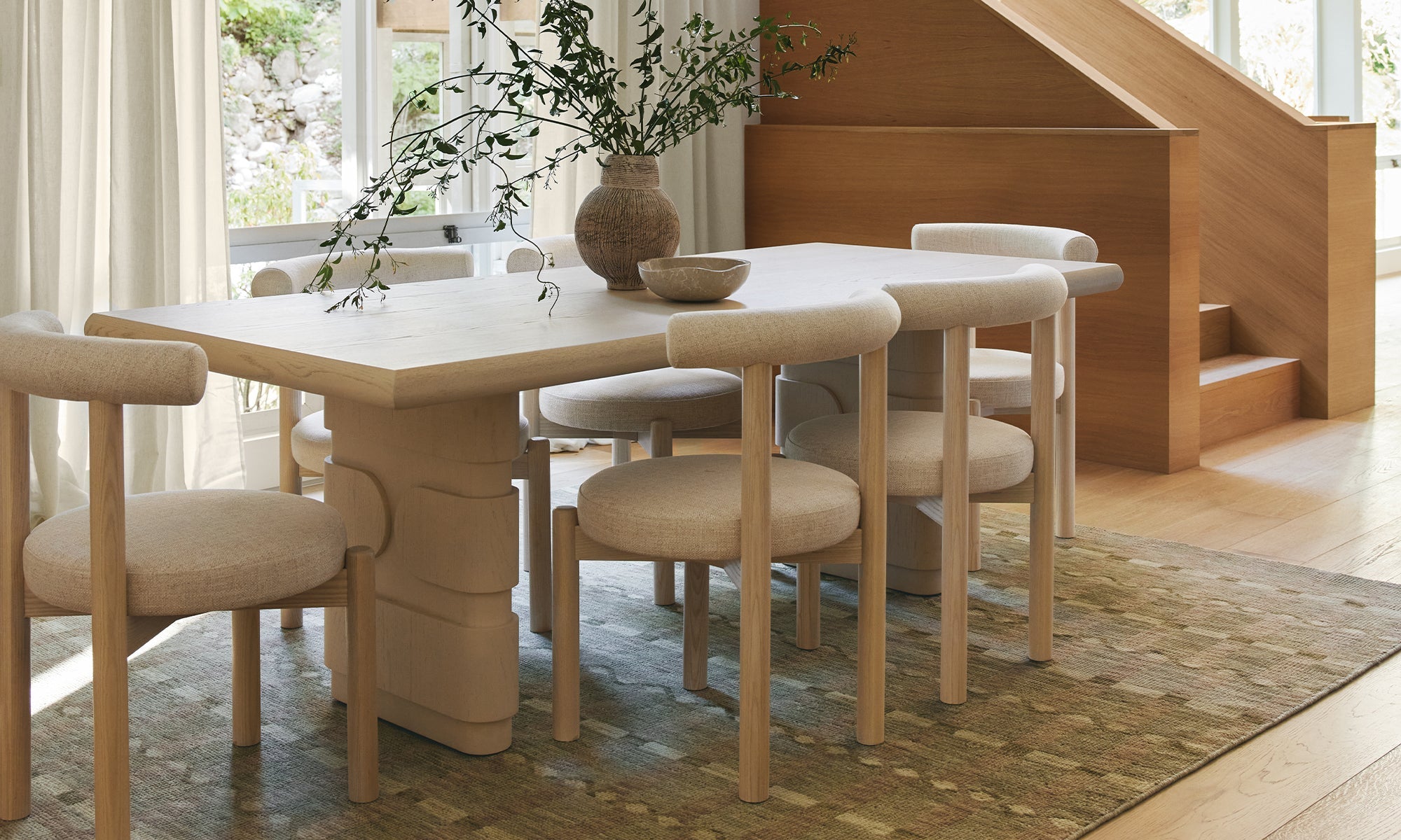 Touches of green bring life to a sculptural dining space awash in subtle textures and neutral tones.