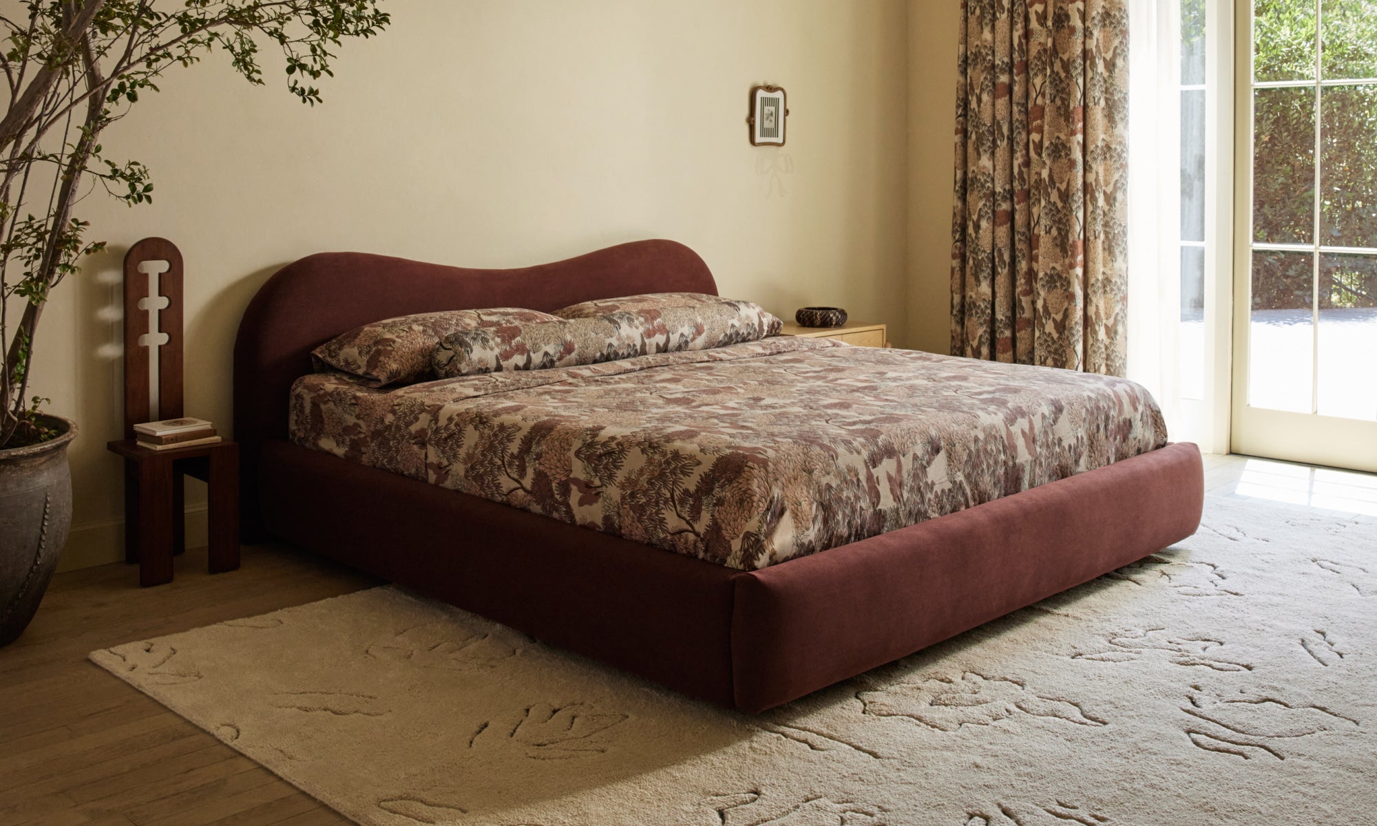 A sculptural bed and tailored details ground this floral-forward bedroom, where softened pattern, earthy contrast, and curated warmth come together in a layered yet refined retreat.