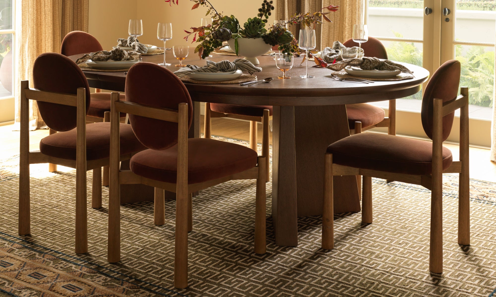Sculptural silhouettes and statement lighting shape a refined dining scene, layered with rich pattern and natural textures throughout.