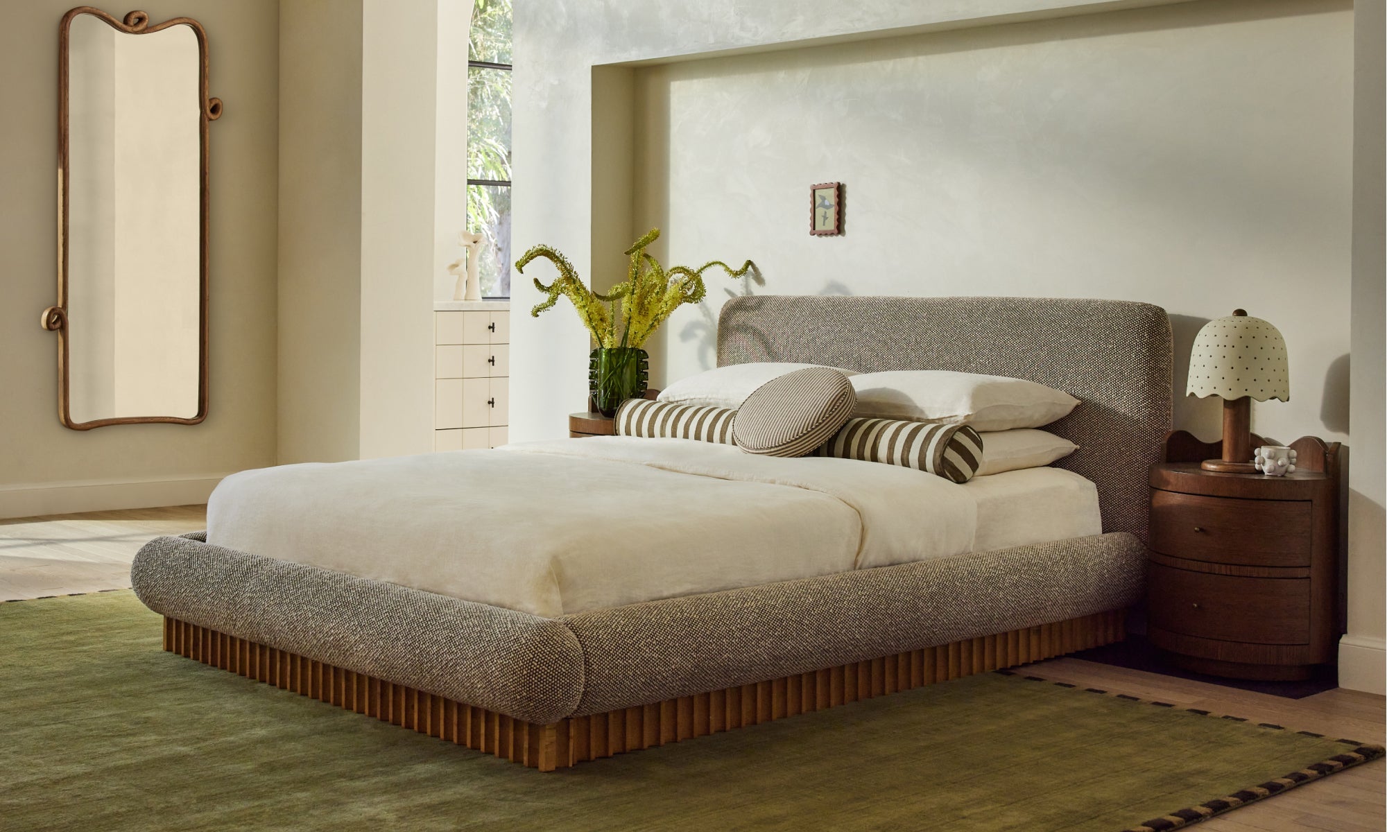 Sculptural lines and sumptuous textures shape a bedroom grounded in softness—where material contrast and whimsical moments create a space of modern repose.