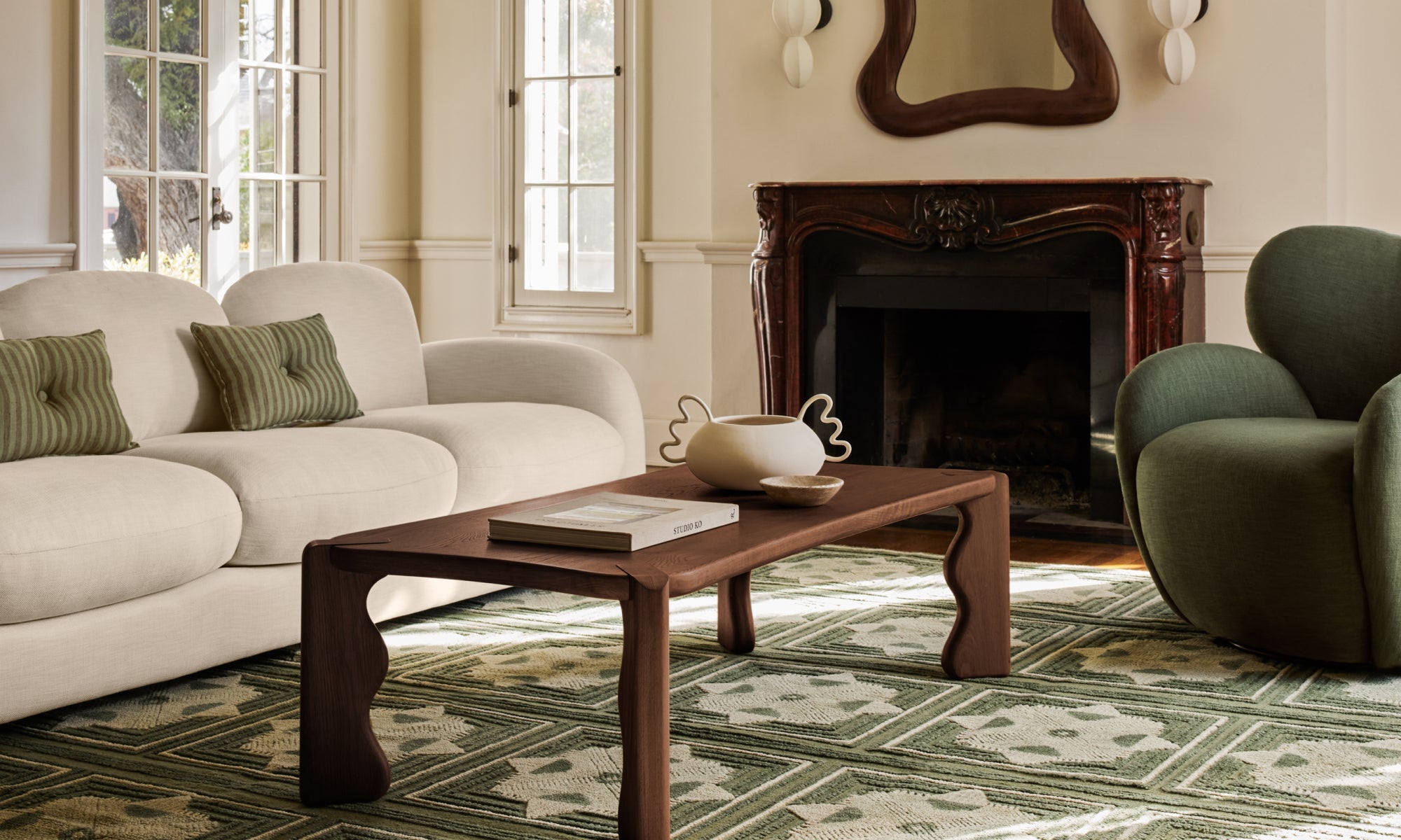 Curved silhouettes combine with a graphic rug to create a living room that’s cheerful yet chic.