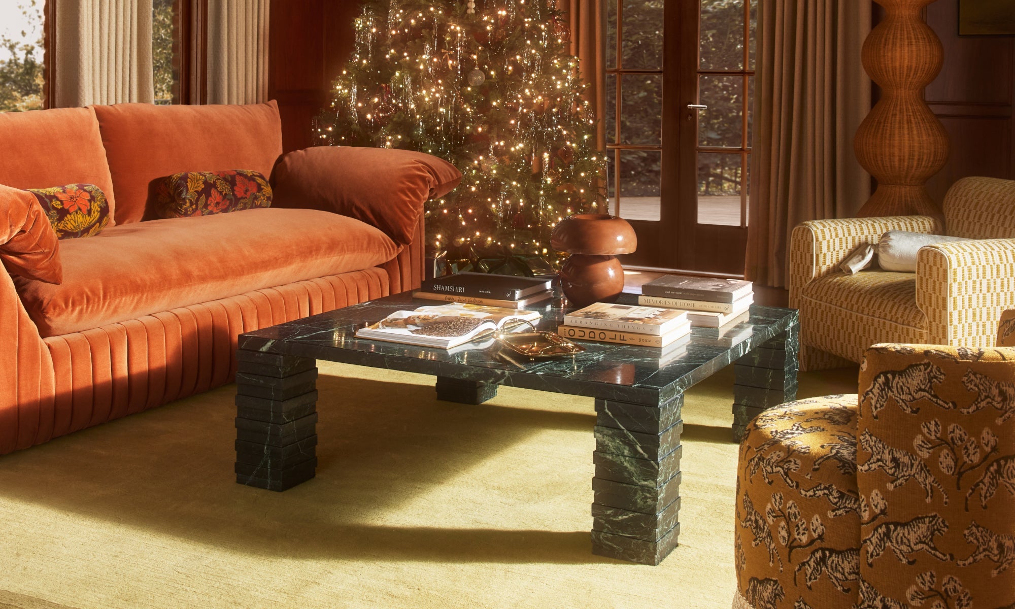 The drama is in the details of this plush seating group. Velvet, marble, and fringe layer the space in sumptuous texture—set on a minimalist rug that lets every touch resonate.