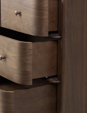 Four Hands brings their exceptional craftsmanship to a timeless collection rooted in Amber Lewis' perennial California style. The Agatha dresser brings a quiet statement to your bedroom with curved drawer fronts and paddle leg detailing. The eight drawers provide ample storage for all your apparel, with space to sort delicates and accessories.