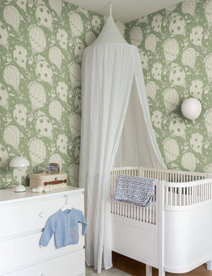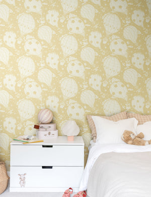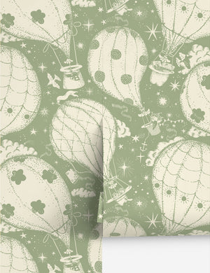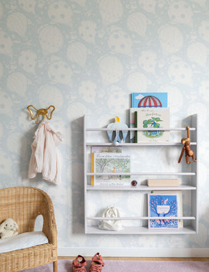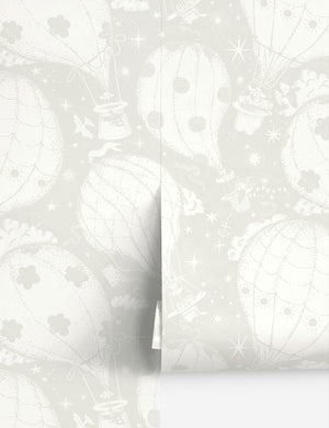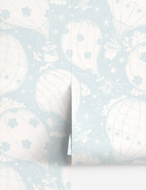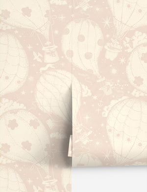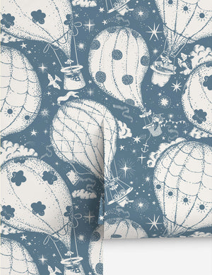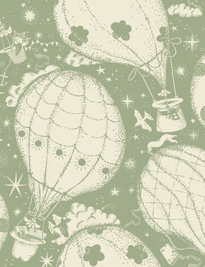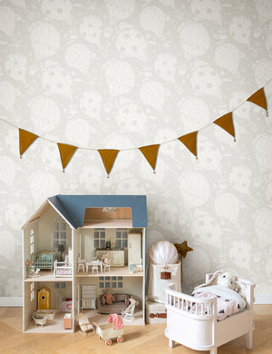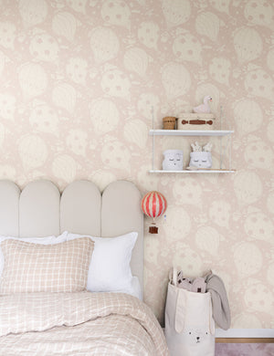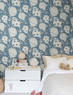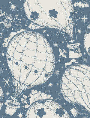 Illustrated hot air balloons drift across a starry sky in this whimsical wallpaper design. The playful motif and endless details invite a sense of adventure and calm, perfect for sparking imagination. A charming nursery wallpaper that brings a touch of wonder to the room.