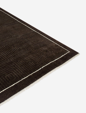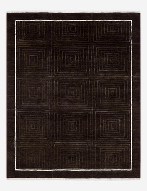 Grounded in a rich chocolate hue, the Barcelona rug pairs geometric patterning with a bold framed border. Meticulously hand-knotted from wool, the design layers texture and detail into a timeless motif. This dark wool rug makes a striking foundation for living rooms, dining spaces, or bedroom curations.