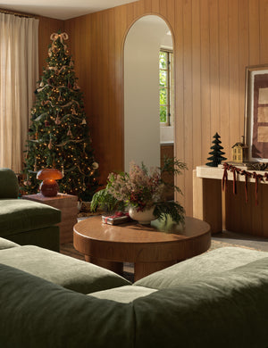 Bold in profile with soft lines, this round coffee table makes a grounded statement in any living space. Thick pillar legs bring sculptural weight, balancing natural grain detail with a modern form. This wood coffee table's rich finish creates presence and impact, imbuing a sleek, organic tone.