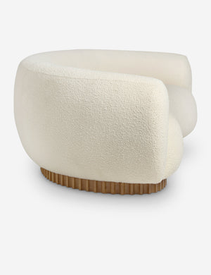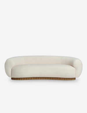 This plush, overstuffed sofa offers an inviting place to land. Set on a rippled wooden plinth base, the bouclé upholstery and contoured silhouette anchor the space with sculptural warmth, styling a statement sofa made for comfort. This piece is from our exclusive Sarah Sherman Samuel collaboration and features all the trademarks of her warm, edited style.