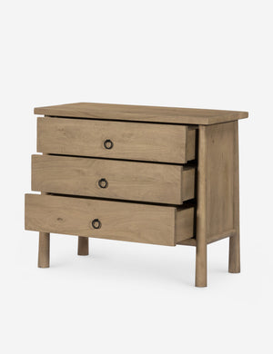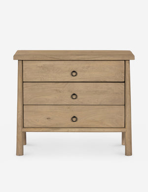 The Canfield dresser styles a vintage look with a modern touch. The wood case features a prominent overhang and tapered legs, finished with three soft-close drawers and cast iron ring pulls. This small dresser is a versatile storage piece that works beautifully in bedrooms, guest spaces, or tucked beneath a window.