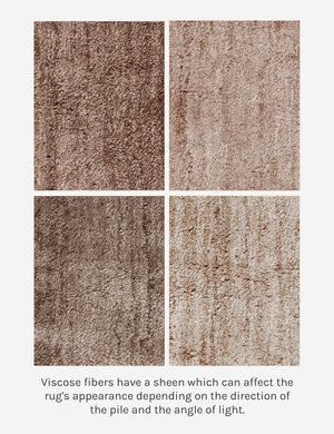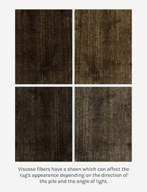 - material: Viscose is a luxurious material with a silky soft touch and a beautiful sheen. Viscose fibers have a sheen which can affect the rug's appearance depending on the direction of the pile and the angle of light. These delicate rugs work best in low-traffic areas like bedrooms and formal lounges away from pets, spills, and other wear and tear.