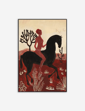 Bring a bold moment to your wall decor with this evocative piece by Jacob Lincoln. An abstract figure on horseback rides through a stylized landscape, rendering a surreal scene in rich, painterly tones. This hand-embellished artwork brings depth and presence to any modern curation.