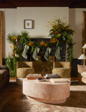 Our Faas coffee table makes a modern statement with an organic silhouette defined by clean lines and a lightly polished marble top. Rich veining creates a sense of movement, styling an elevated anchor for richly layered spaces. With its generous scale and low profile, this large coffee table offers a grounding centerpiece in any seating arrangement.