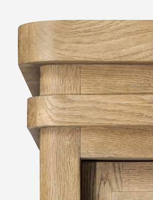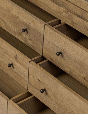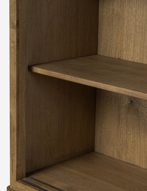 Traditional lines and a warm oak grain fashion this large curio cabinet with a stately bearing. The glass-front shelving and six spacious drawers offer plenty of room for both discreet storage and curated display. The sliding glass doors add a seamless touch, perfect for a space that folds timeless elements into a modern design.