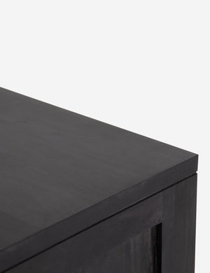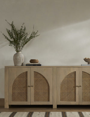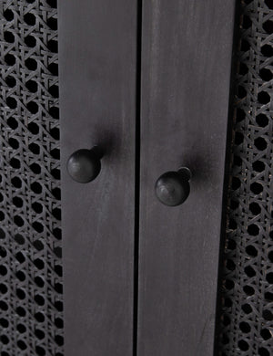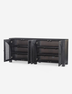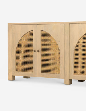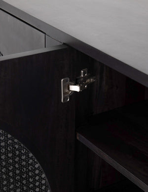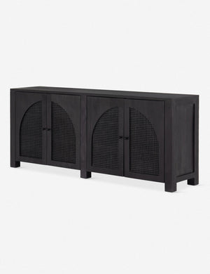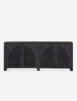Arched cane panels bring a Moroccan look to this wood sideboard, making it the perfect transitional storage piece. In an all-black finish with iron hardware, this storage cabinet adds grounding style to your dining room or living room.