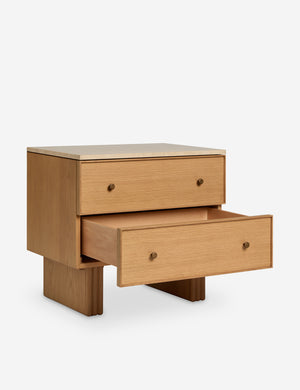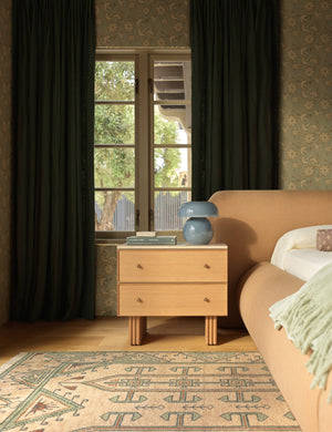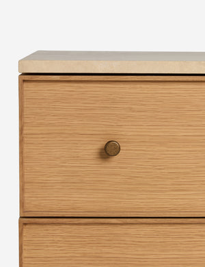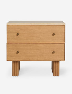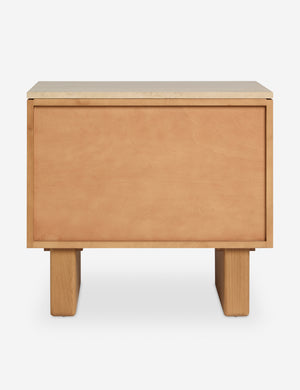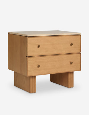 A mix of rich materials and thoughtful design define our Keshan nightstand. The oak case is topped with natural travertine for a grounded yet refined finish, while fluted legs lift the profile with sculptural poise. This large nightstand's silhouette is low-slung and wide, offering spacious storage with a stylish edge.