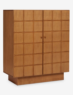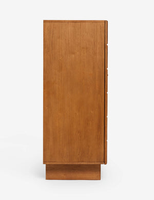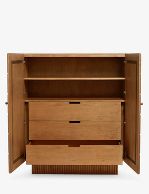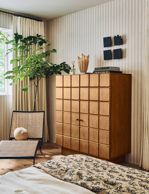 The Lee dresser offers visual intrigue and natural grain warmth with its blockwork detailing and fluted plinth base. The name is a nod to Sarah's dad, who fabricated the custom doors on which the drawer front is based. The tall design features a compact footprint with cabinet doors opening to spacious storage, including three interior drawers. This dresser is from our exclusive Sarah Sherman Samuel collaboration and features all the trademarks of her warm, edited style.