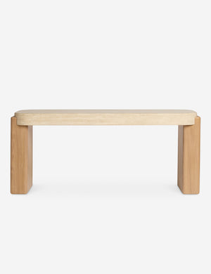 Our Midora console table sets the tone for understated impact. A slab of honed travertine rests atop softly sculpted wood legs, grounding the design with a modern edge. Rooted in natural materials, it makes a beautiful entryway table, bridging the shift from an organic environment to a curated interior.