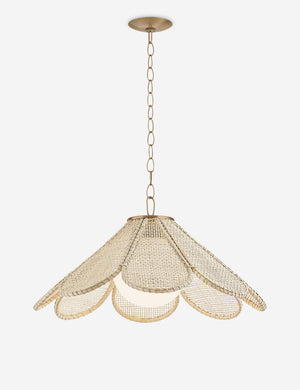 Handwoven rattan petals encircle an opal glass globe, giving the Nerola pendant an airy charm. Suspended by a patina brass chain, the floral-inspired design feels both natural and refined. This pendant light offers an artful layer of lighting for a kitchen or breakfast nook.