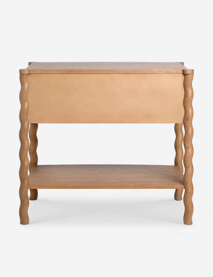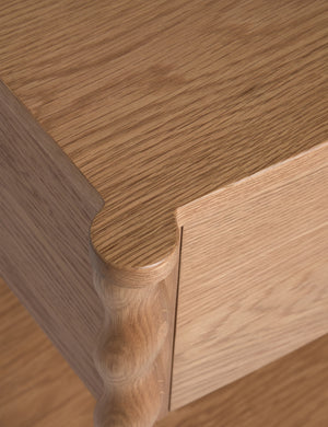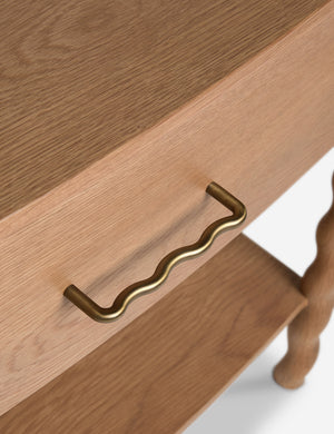 Our Norma nightstand offers natural grain texture with a twist. The clean wood silhouette is offset by turned legs and a wavy brass-finished handle, bringing a modern edge to the versatile design. A soft-close drawer completes this wood nightstand with a touch of elegance.