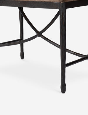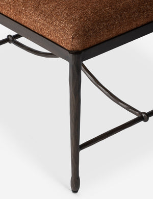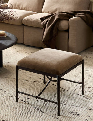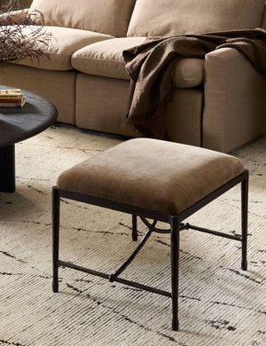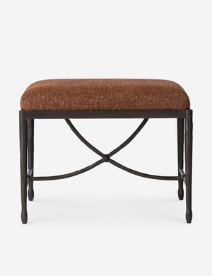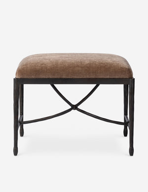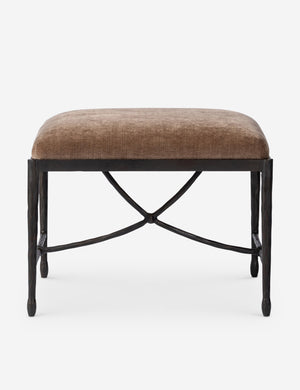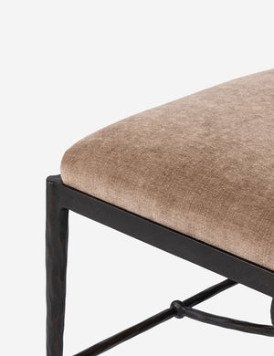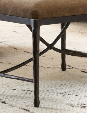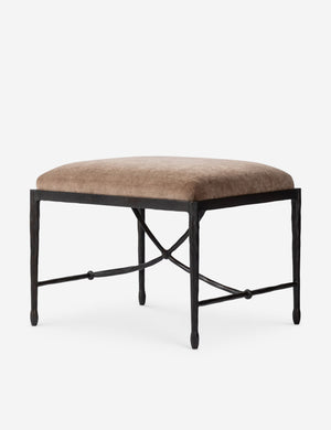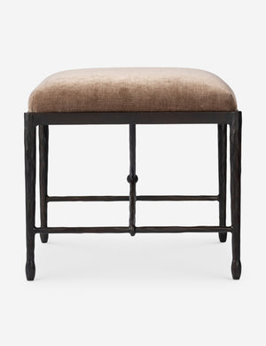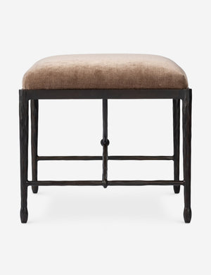 Perlaza blends transitional ease with Art Deco style in a sleek, streamlined silhouette. This stool pairs plush velvet upholstery with a hammered iron base featuring curved stretchers that bring a graceful bearing to the design. Whether placed in a pair at the foot of a bed, in an entryway, or styled beneath a window, it offers an elevating touch with a timeless feel.