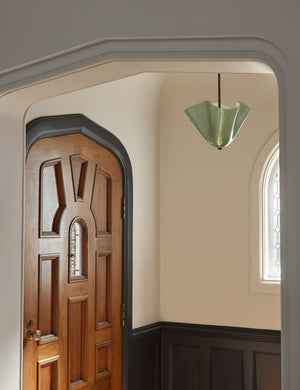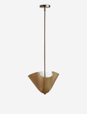 Gentle folds shape the fluid silhouette of our Radner pendant light. Touches of brass complement the colored glass shade, enhancing its warm tones with a burnished glow—styling a sleek pendant that creates a rich yet subtle statement overhead.