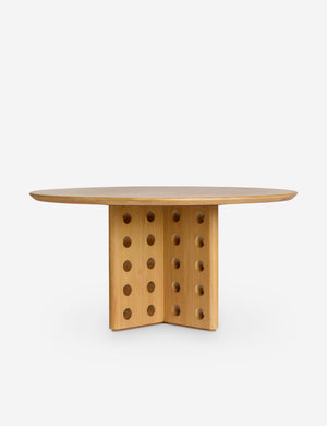 The Reika dining table features a round top set on a perforated cross-base in a design that feels airy yet grounded. The clean rhythm of the circular cutouts adds a modern edge to the natural wood grain, creating a sculptural silhouette that anchors the room. This table is from our exclusive Sarah Sherman Samuel collaboration and features all the trademarks of her warm, edited style.