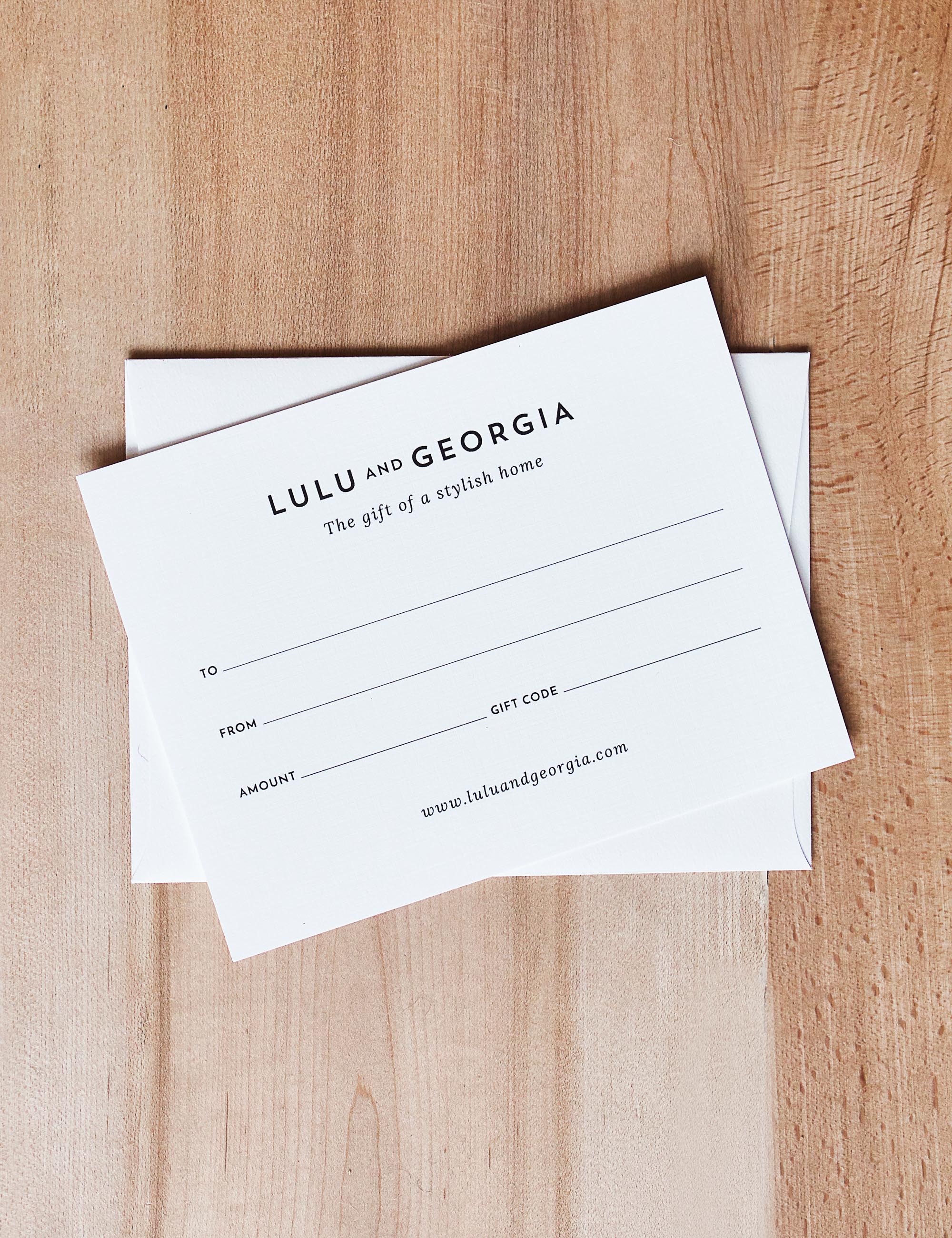 Give the gift of Lulu & Georgia with our e-gift cards! Whether for a birthday, wedding or holiday present, a gift card is always a perfect present. Simply choose from the dollar amount options and we'll send you an e-mail with your gift card code. This item is final sale.