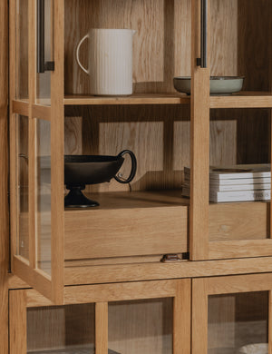 The Santos curio cabinet highlights traditional craftsmanship in a warm, wire-brushed oak finish. A tall frame with glass-front doors and molded details provides ample room for display, featuring interior drawers and cable management for added functionality. Standing over six feet, this tall cabinet brings an elegant storage piece to living or dining spaces.