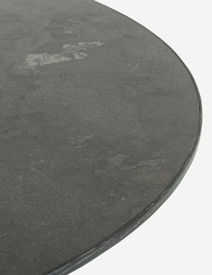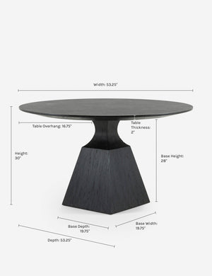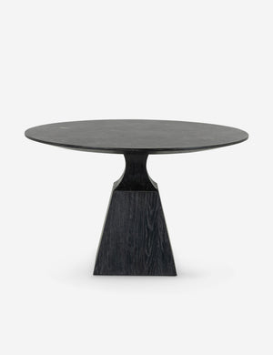 With a sculptural black oak base and beautiful bluestone tabletop, this round dining table is set for dramatic impact. The mixed materiality offers a refined touch perfect for a moody dining room look. A wire brushed finish of this dinner table showcases the textural grain of its oak construction.