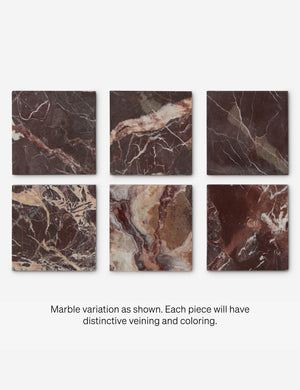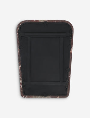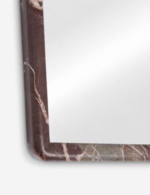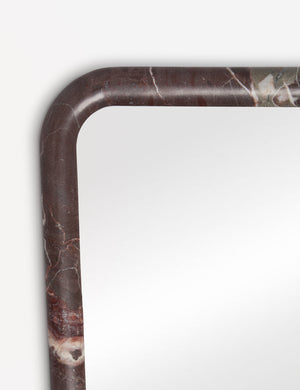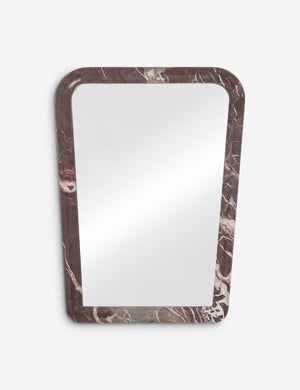 Our Sistine mirror cuts a bold profile in red marble. Rounded corners and a tapered shape add softness to the polished stone, styling a chic wall mirror that elevates any curation with quiet drama.