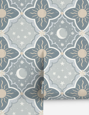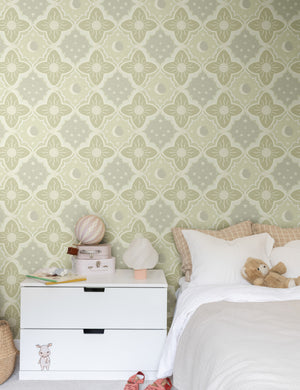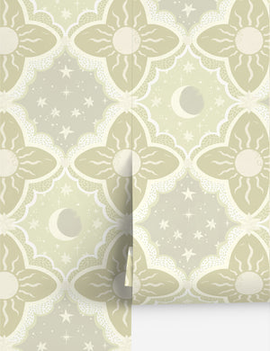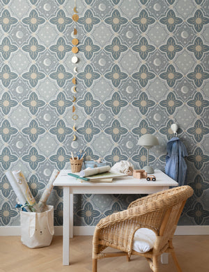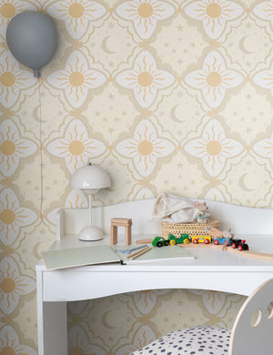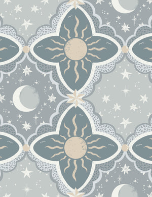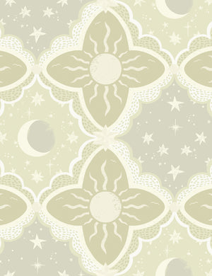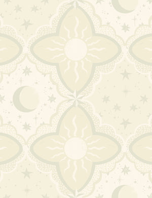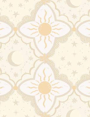 Celestial suns, moons, and stars repeat in a gentle quatrefoil pattern across this timeless wallpaper. The soft pattern brings a soothing rhythm to the room, offering just the right touch of whimsy. It makes a refined nursery wallpaper that glows with subtle charm.