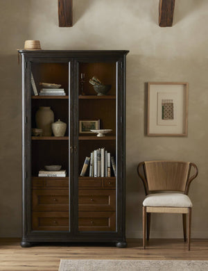 Four Hands brings their exceptional craftsmanship to a timeless collection rooted in Amber Lewis' perennial California style. The oak grain pairs with bun feet and a smooth cornice to bring timeless style to this modern curio cabinet. Five drawers are tucked behind glass doors, while puck lights illuminate anything placed within the open upper section, creating a perfect spot for art or decor.