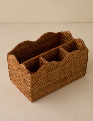 Bring a fresh look to your kitchen or dining space with the scalloped edge and woven texture of this rattan utensil caddy. Perfect for flatware, napkins, or sauces, it keeps essentials within reach while adding a layer of organic warmth to your table or countertop.
